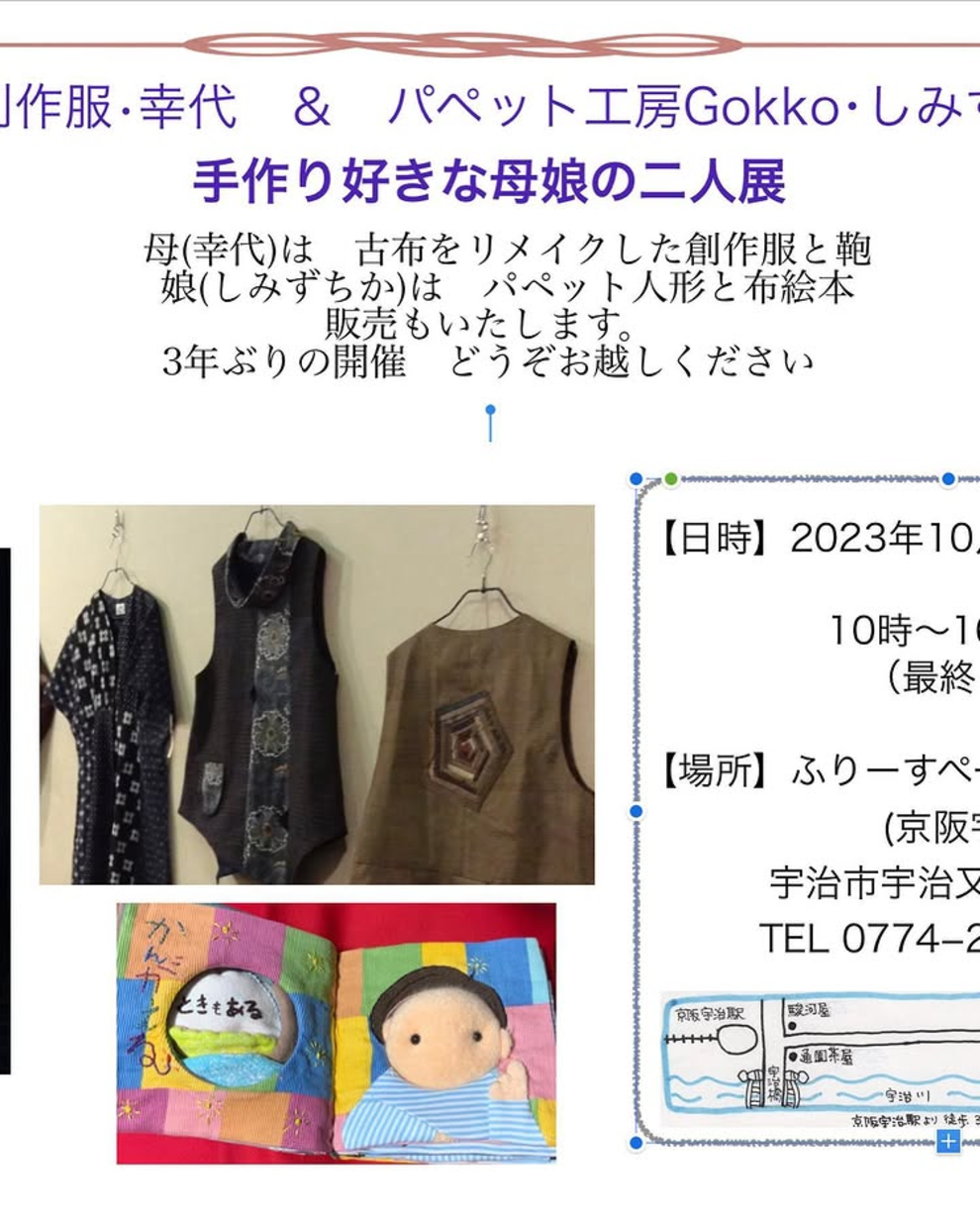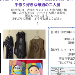 2023/10/16 お知らせ 母娘二人展 「母娘二人展」 2023年10月19日〜22日 ギャラリー宇治日和にて。 写真は母の作品「古布創作服」。 一見、古布?って思うほど華やかなコートやスカート。 古布と向き合って作り上げた母の手仕事をご覧いただきたい。 News一覧へ戻る